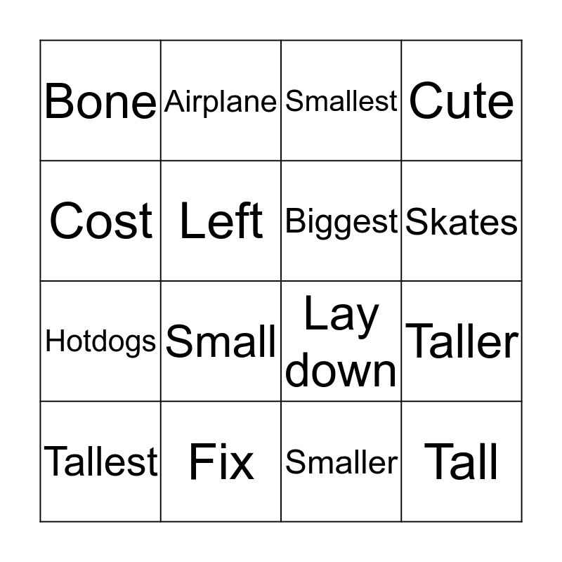 This bingo card has 24 words: Snake, Smoke, Skates, Face, Cost, Bone, Left, Airplane, Fix, Float, Hotdogs, Lay down, The last time, Bigger, Biggest, Big, Smaller, Smallest, Small, Taller, Tallest, Tall, Cute and Cutest.