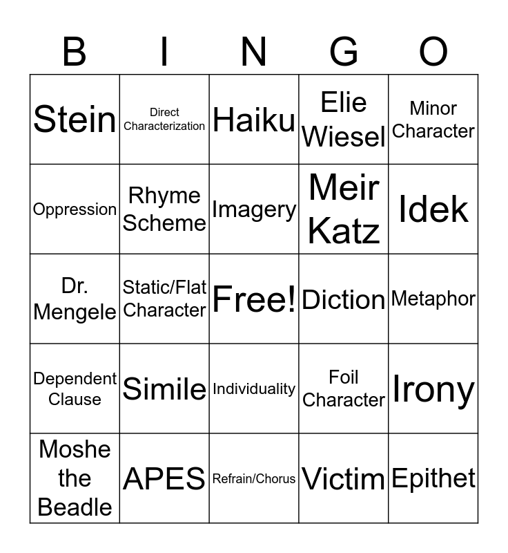 This bingo card has a free space and 72 words: Indirect Characterization, Direct Characterization, Static/Flat Character, Dynamic/Round Character, Protagonist, Antagonist, Elie Wiesel, Chlomo Wiesel, Meir Katz, Rabbi Eliahou’s son, Moshe the Beadle, Madame Schachter, Idek, Stein, Akiba Drummer, Dr. Mengele, Foil Character, Minor Character, Major Character, Metaphor, Simile, Epithet, Irony, Pun, Hyperbole, Personification, Foreshadow, Onomatopoeia, Symbolism/Symbol, Allusion, APES, Aggressor, Bystander, Upstander, Victim, Target, Indifference, Peril, Oppression, Dehumanization, Individuality, Identity (and the loss of identity), Genocide, Theme, Independent Clause, Dependent Clause, Alliteration, Assonance, Ballad, Concrete Poem, Connotation, Couplet, Denotation, Diction, Euphemism, Free Verse, Haiku, Imagery, Internal Rhyme, Limerick, Lyrics, Onomatopoeia, Poem, Refrain/Chorus, Repetition, Rhyme, Rhyme Scheme, Song, Sonnet, Speaker, Stanzas and Symbol.