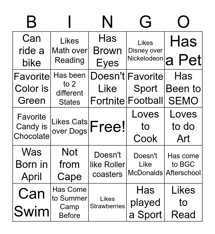 This bingo card has a free space and 24 words: Not from Cape, Has Come to Summer Camp Before, Doesn't Like Fortnite, Can Swim, Has a Pet, Can ride a bike, Favorite Color is Green, Likes Math over Reading, Loves to Cook, Doesn't like Roller coasters, Favorite Sport Football, Favorite Candy is Chocolate, Doesn't Like McDonalds, Has come to BGC Afterschool, Has been to 2 different States, Has played a Sport, Loves to do Art, Has Brown Eyes, Has Been to SEMO, Likes Cats over Dogs, Likes to Read, Was Born in April, Likes Disney over Nickelodeon and Likes Strawberries.