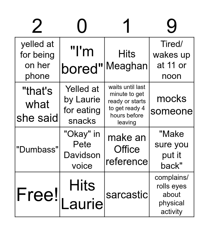 This bingo card has 16 words: Hits Laurie, "Make sure you put it back", Hits Meaghan, yelled at for being on her phone, "Dumbass", "I'm bored", make an Office reference, sarcastic, "that's what she said, Yelled at by Laurie for eating snacks, Free!, Tired/ wakes up at 11 or noon, "Okay" in Pete Davidson voice, mocks someone, waits until last minute to get ready or starts to get ready 4 hours before leaving and complains/ rolls eyes about physical activity.