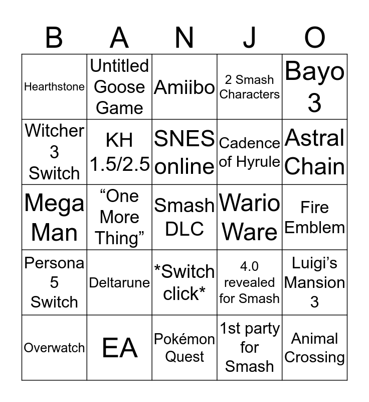 This bingo card has a free space and 24 words: Overwatch, Deltarune, SNES online, 1st party for Smash, Bayo 3, Hearthstone, Untitled Goose Game, Amiibo, Wario Ware, Fire Emblem, Mega Man, KH 1.5/2.5, 4.0 revealed for Smash, Luigi’s Mansion 3, Witcher 3 Switch, EA, Pokémon Quest, 2 Smash Characters, Astral Chain, Persona 5 Switch, “One More Thing”, *Switch click*, Cadence of Hyrule and Animal Crossing.