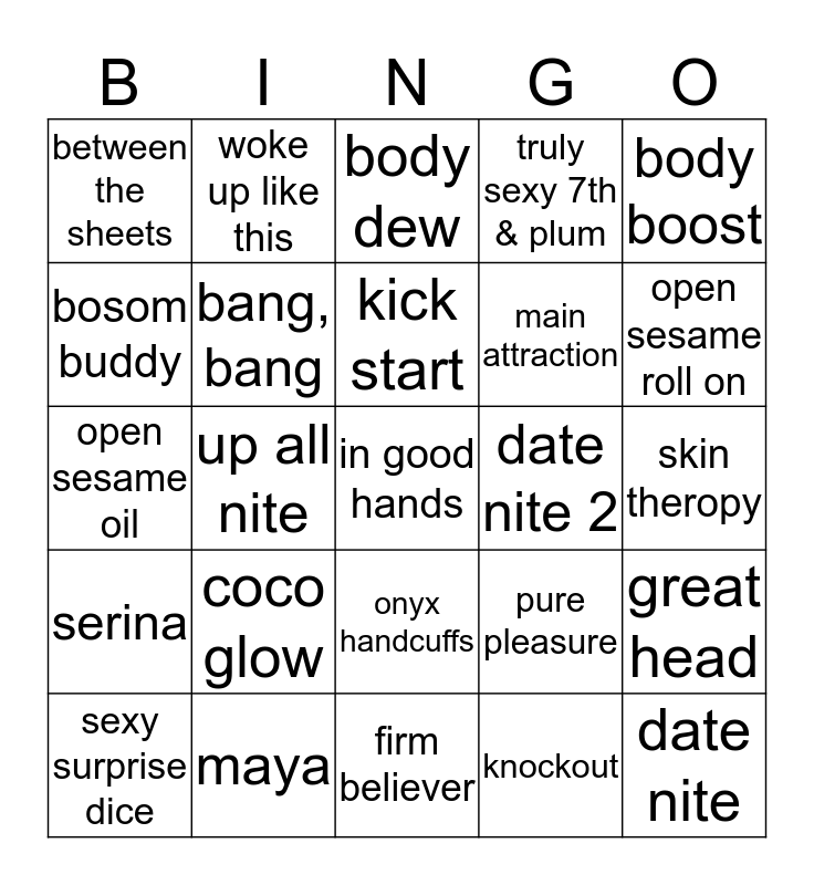 This bingo card has 80 words: just like me, skinny dip, body dew, kiss, body lotion, clean, hydrate body oil, shave, hydrate body lotion, spray, coochy, flirt rollerball, truly sexy 7th & plum, between the sheets, afterglow, bosom buddy, basic instinct, coco glow, save my skin, skin theropy, miracle oil, body boost, open sesame oil, kick start, bang, bang, fractionated coconut oil, lavender and chamomile message, moisture repair balm, bang bang roll on, rise and grind, open sesame roll on, time to go flo roll on, firm believer, date nite, sexy surprise dice, date nite 2, burning desire, between the sheets, heart throb, in good hands, heart messager, sheer beauty, twilight, Moulin rose, dark temptations, woke up like this, the temptress, take the plunge, sexy back, blush, great head, up all nite, pure pleasure, whipped, amp, o, sensations, onyx whip, onyx teaser, onyx handcuffs, main attraction, premiere, opening act, double feature, take two, mania, thirst, luna, stella, aqua, serina, maya, kaia, hot & bothered, head over heals, love struck, knockout, bombshell, maverick and hand jive.
