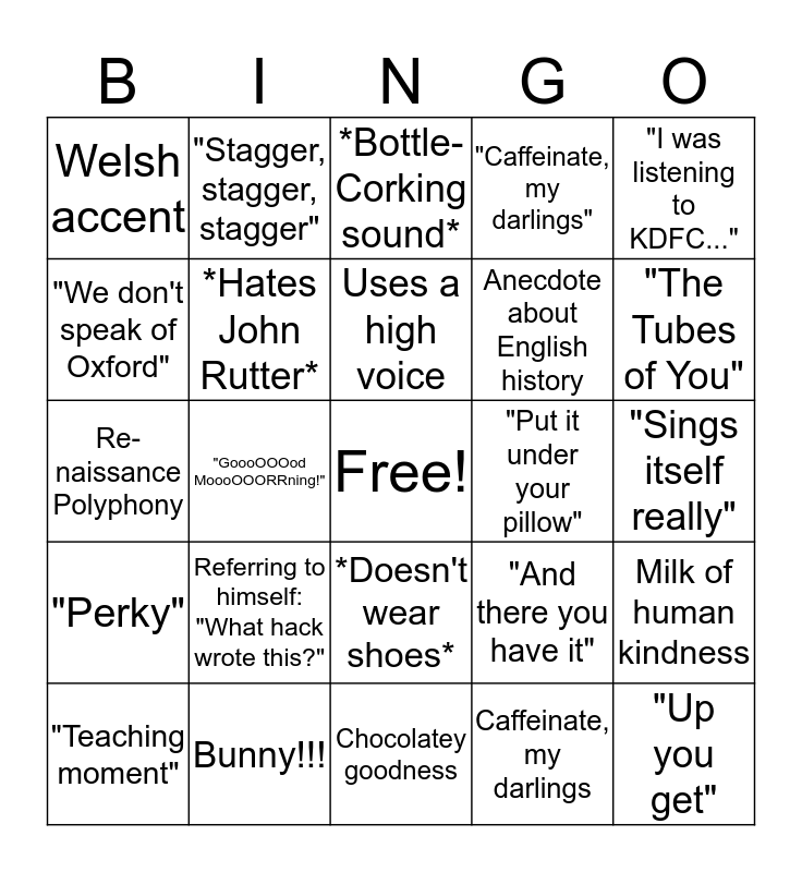 This bingo card has a free space and 24 words: Referring to himself: "What hack wrote this?", Bunny!!!, Uses a high voice, "Teaching moment", "I was listening to KDFC...", Welsh accent, "We don't speak of Oxford", "Stagger, stagger, stagger", "Put it under your pillow", *Doesn't wear shoes*, Anecdote about English history, Re-naissance Polyphony, "And there you have it", Milk of human kindness, *Hates John Rutter*, Caffeinate, my darlings, "Sings itself really", *Bottle-Corking sound*, "The Tubes of You", "GoooOOOod MoooOOORRning!", "Up you get", "Perky", "Caffeinate, my darlings" and Chocolatey goodness.