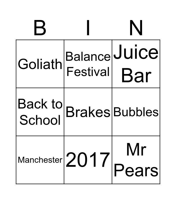 This bingo card has a free space and 11 words: Milk & More, 2017, Mr Pears, Manchester, Balance Festival, Juice Bar, Bubbles, Juicy Water, Back to School, Goliath and FREE.