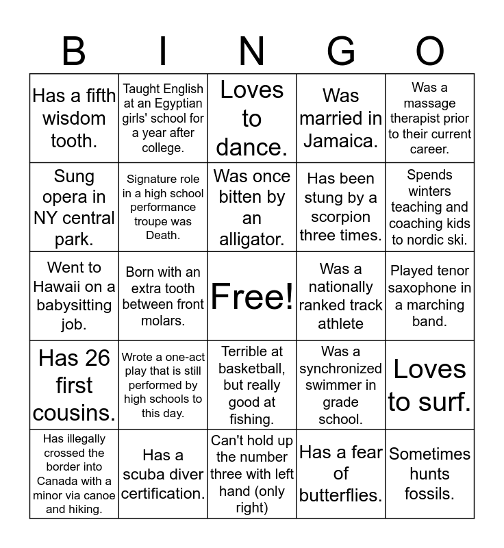 This bingo card has a free space and 24 words: Wrote a one-act play that is still performed by high schools to this day., Has a scuba diver certification., Was once bitten by an alligator., Has illegally crossed the border into Canada with a minor via canoe and hiking., Was a massage therapist prior to their current career., Has a fifth wisdom tooth., Sung opera in NY central park., Taught English at an Egyptian girls' school for a year after college., Was a nationally ranked track athlete, Terrible at basketball, but really good at fishing., Has been stung by a scorpion three times., Went to Hawaii on a babysitting job., Was a synchronized swimmer in grade school., Loves to surf., Signature role in a high school performance troupe was Death., Has a fear of butterflies., Played tenor saxophone in a marching band., Loves to dance., Spends winters teaching and coaching kids to nordic ski., Born with an extra tooth between front molars., Sometimes hunts fossils., Has 26 first cousins., Was married in Jamaica. and Can't hold up the number three with left hand (only right).