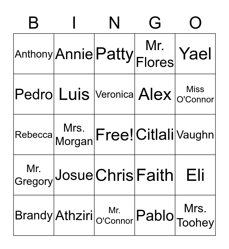 This bingo card has a free space and 24 words: Josue, Athziri, Veronica, Brandy, Yael, Anthony, Pedro, Annie, Citlali, Chris, Alex, Rebecca, Faith, Eli, Luis, Pablo, Vaughn, Patty, Miss O'Connor, Mrs. Morgan, Mrs. Toohey, Mr. Gregory, Mr. Flores and Mr. O'Connor.