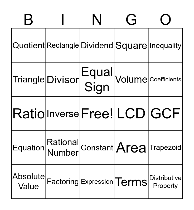 This bingo card has a free space and 29 words: Absolute Value, Integer, Inverse, Product, Quotient, Dividend, Divisor, Rational Number, LCD, Factoring, GCF, Distributive Property, Expression, Terms, Coefficients, Variable, Constant, Equation, Inequality, Ratio, Area, Perimeter, Volume, Triangle, Square, Rectangle, Trapezoid, Equal Sign and Estimate.