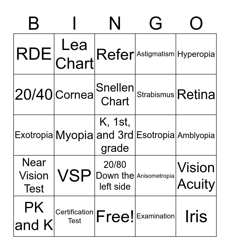 This bingo card has 25 words: Near Vision Test, Certification Test, K, 1st, and 3rd grade, Examination, Hyperopia, RDE, Lea Chart, Refer, Esotropia, Vision Acuity, 20/40, Cornea, Free!, Anisometropia, Retina, PK and K, Myopia, Snellen Chart, Strabismus, Amblyopia, Exotropia, VSP, 20/80 Down the left side, Astigmatism and Iris.