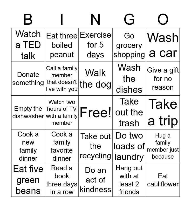 This bingo card has a free space and 24 words: Cook a family favorite dinner, Read a book three days in a row, Walk the dog, Eat five green beans, Wash a car, Watch a TED talk, Donate something, Eat three boiled peanut, Take out the trash, Take out the recycling, Wash the dishes, Empty the dishwasher, Do two loads of laundry, Hug a family member just because, Call a family member that doesn't live with you, Hang out with at least 2 friends, Take a trip, Exercise for 5 days, Give a gift for no reason, Watch two hours of TV with a family member, Eat cauliflower, Cook a new family dinner, Go grocery shopping and Do an act of kindness.