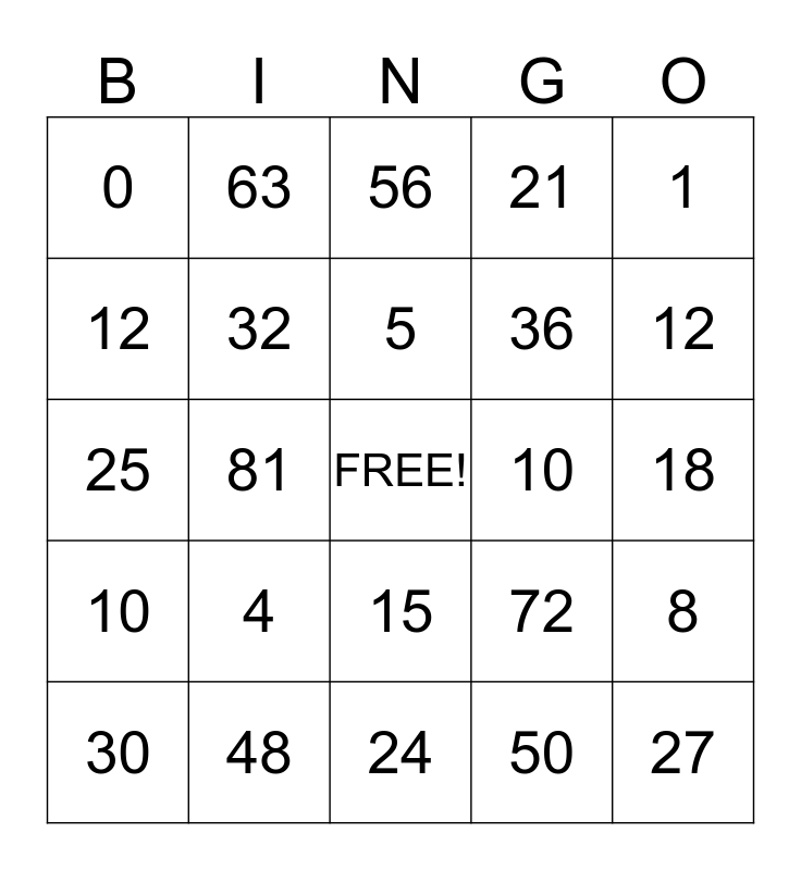 This bingo card has a free space and 24 words: 4, 48, 5, 30, 1, 0, 12, 63, 10, 15, 36, 25, 72, 8, 32, 50, 18, 56, 12, 81, 27, 10, 21 and 24.