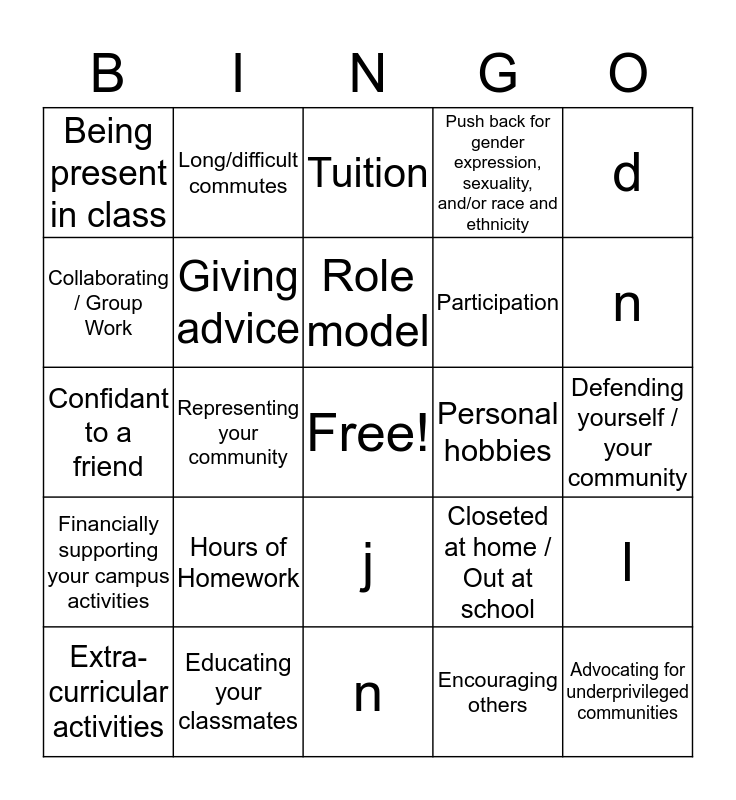 This bingo card has a free space and 24 words: Hours of Homework, Educating your classmates, Role model, Extra-curricular activities, d, Being present in class, Collaborating / Group Work, Long/difficult commutes, Personal hobbies, j, Participation, Confidant to a friend, Closeted at home / Out at school, l, Giving advice, Encouraging others, Defending yourself / your community, Tuition, n, Representing your community, Advocating for underprivileged communities, Financially supporting your campus activities, Push back for gender expression, sexuality, and/or race and ethnicity and n.