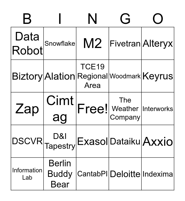 This bingo card has a free space and 24 words: D&I Tapestry, Berlin Buddy Bear, TCE19 Regional Area, Information Lab, Alteryx, Data Robot, Biztory, Snowflake, The Weather Company, Exasol, Woodmark, Zap, Dataiku, Axxio, Alation, Deloitte, Interworks, M2, Keyrus, Cimt ag, Indexima, DSCVR, Fivetran and CantabPI.