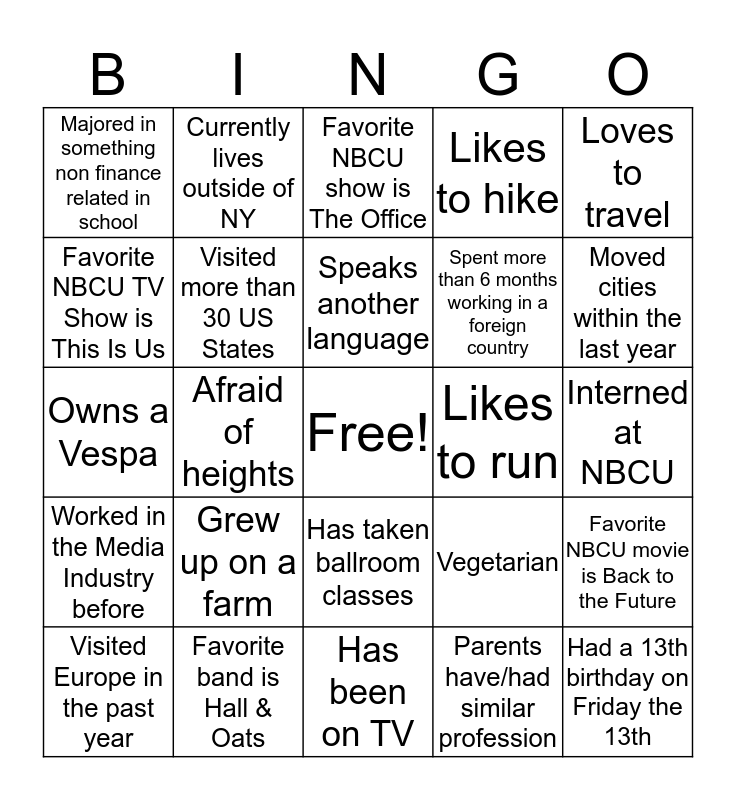 This bingo card has a free space and 24 words: Grew up on a farm, Favorite band is Hall & Oats, Speaks another language, Visited Europe in the past year, Loves to travel, Majored in something non finance related in school, Favorite NBCU TV Show is This Is Us, Currently lives outside of NY, Likes to run, Has taken ballroom classes, Spent more than 6 months working in a foreign country, Owns a Vespa, Vegetarian, Favorite NBCU movie is Back to the Future, Visited more than 30 US States, Parents have/had similar profession, Interned at NBCU, Favorite NBCU show is The Office, Moved cities within the last year, Afraid of heights, Had a 13th birthday on Friday the 13th, Worked in the Media Industry before, Likes to hike and Has been on TV.