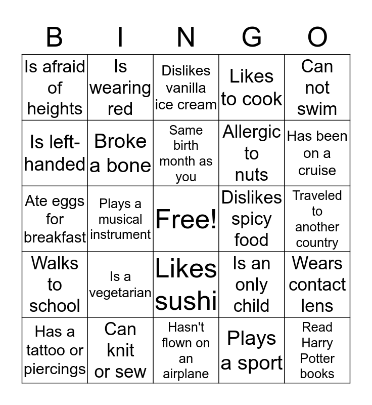 This bingo card has a free space and 29 words: Has a tattoo or piercings, Has flown on an airplane, Plays a musical instrument, Has gone fishing, Is afraid of heights, Dislikes vanilla ice cream, Broke a bone, Is a vegetarian, Dislikes spicy food, Can knit or sew, Traveled to another country, Read Harry Potter books, Hasn't flown on an airplane, Plays a sport, Has been on a cruise, Enjoys creating art, Likes sushi, Walks to school, Can not swim, Ate eggs for breakfast, Is an only child, Works part-time, Allergic to nuts, Is left-handed, Likes to cook, Is wearing red, Wears contact lens, Same birth month as you and Did volunteer work at a hospital.