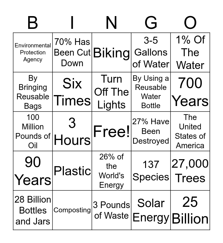 This bingo card has a free space and 24 words: 28 Billion Bottles and Jars, Plastic, Turn Off The Lights, Solar Energy, 1% Of The Water, Environmental Protection Agency, 70% Has Been Cut Down, Biking, 27% Have Been Destroyed, The United States of America, 100 Million Pounds of Oil, Six Times, 137 Species, 27,000 Trees, By Bringing Reusable Bags, Composting, 3 Pounds of Waste, 3-5 Gallons of Water, 700 Years, 90 Years, 3 Hours, 26% of the World's Energy, By Using a Reusable Water Bottle and 25 Billion.