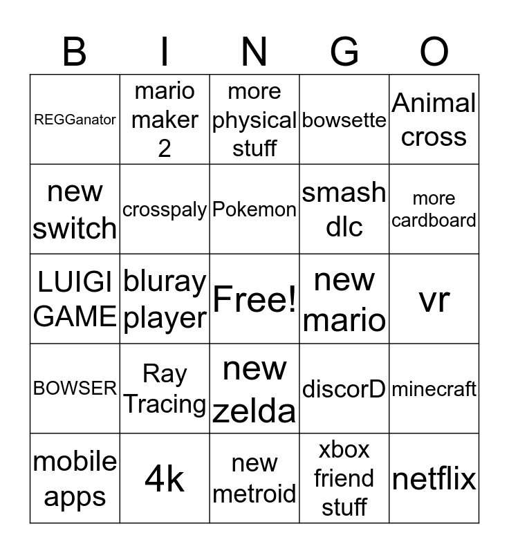 This bingo card has a free space and 24 words: Ray Tracing, 4k, Pokemon, mobile apps, Animal cross, REGGanator, new switch, mario maker 2, new mario, new zelda, smash dlc, LUIGI GAME, discorD, minecraft, crosspaly, xbox friend stuff, vr, more physical stuff, more cardboard, bluray player, netflix, BOWSER, bowsette and new metroid.