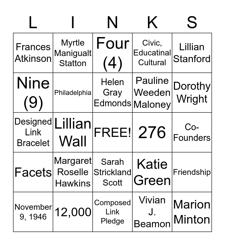 This bingo card has a free space and 24 words: Margaret Roselle Hawkins, 12,000, Helen Gray Edmonds, November 9, 1946, Lillian Stanford, Frances Atkinson, Nine (9), Myrtle Manigualt Statton, 276, Sarah Strickland Scott, Pauline Weeden Maloney, Designed Link Bracelet, Katie Green, Friendship, Philadelphia, Vivian J. Beamon, Co-Founders, Four (4), Dorothy Wright, Lillian Wall, Marion Minton, Facets, Civic, Educatinal Cultural and Composed Link Pledge.