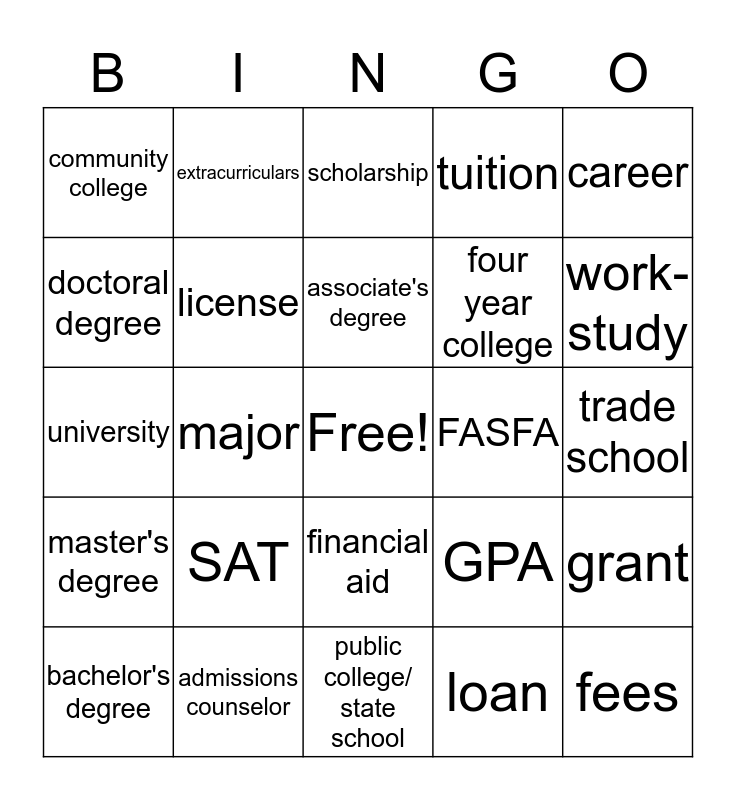This bingo card has a free space and 24 words: SAT, admissions counselor, associate's degree, bachelor's degree, career, community college, doctoral degree, extracurriculars, FASFA, financial aid, four year college, university, GPA, grant, license, loan, trade school, scholarship, work-study, major, fees, master's degree, tuition and public college/ state school.