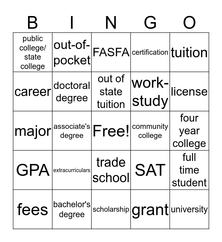 This bingo card has a free space and 29 words: fees, admissions counselor, associate's degree, financial aid, public college/ state college, FASFA, doctoral degree, extracurriculars, community college, bachelor's degree, four year college, university, scholarship, grant, license, loan, trade school, GPA, tuition, major, SAT, master's degree, work-study, career, certification, out-of-pocket, full time student, out of state tuition and deferrment.