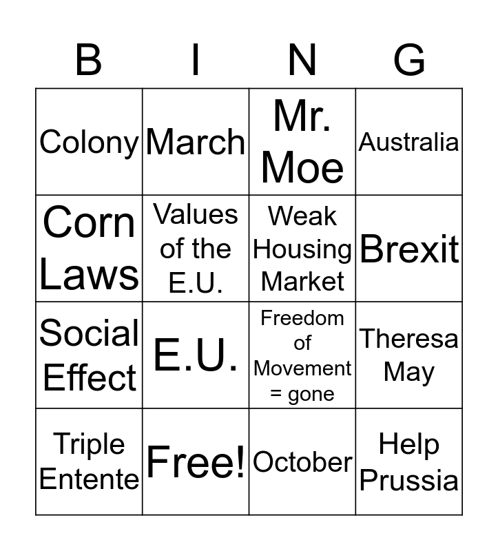 This bingo card has 24 words: N.A.T.O, Utrecht, Brexit, MCKAY, Corn Laws, Colony, Values of the E.U., March, Free!, EURO, Social Effect, Freedom of Movement = gone, Great Famine, Navigation Acts, Weak Housing Market, Economic Effect, October, Mr. Moe, E.U., Theresa May, Triple Entente, Help Prussia, Australia and June 7th.