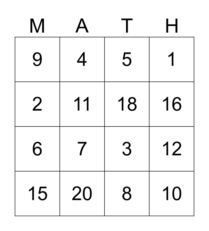 This bingo card has 16 words: 20, 12, 5, 9, 6, 4, 3, 8, 2, 11, 15, 1, 7, 16, 18 and 10.