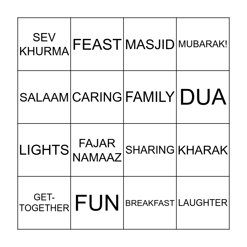 This bingo card has 20 words: KHARAK, GLITTER, MASJID, SHARBAT, GET-TOGETHER, SALAAM, FUN, SEV KHURMA, LIGHTS, FEAST, FAJAR NAMAAZ, SHARING, CARING, LAUGHTER, FAMILY, RAMAZAN, DUA, MUBARAK!, BREAKFAST and SUNRISE.