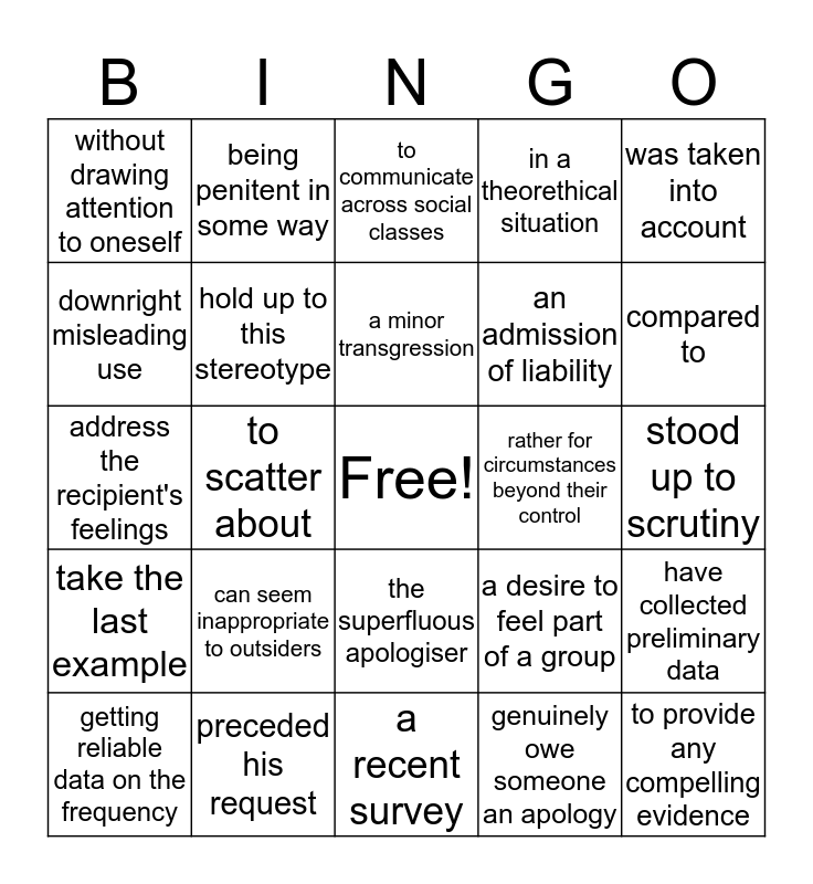 This bingo card has a free space and 29 words: getting reliable data on the frequency, being late to a meeting, to scatter about, this doesn't necessarily mean, without drawing attention to oneself, to communicate across social classes, hold up to this stereotype, can seem inappropriate to outsiders, rather for circumstances beyond their control, preceded his request, stood up to scrutiny, to provide any compelling evidence, a recent survey, genuinely owe someone an apology, compared to, a sign of weakness, the superfluous apologiser, take the last example, was taken into account, address the recipient's feelings, a desire to feel part of a group, can be traced to, an admission of liability, downright misleading use, in a theorethical situation, being penitent in some way, have collected preliminary data, a minor transgression and embellish it with.