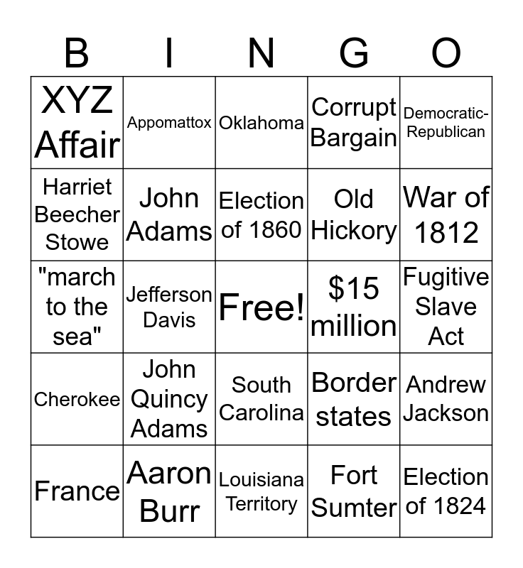 This bingo card has a free space and 38 words: James Madison, Ford's Theatre, Henry Clay, John Adams, Andrew Jackson, John Quincy Adams, Election of 1860, Federalist, Democratic-Republican, Old Hickory, Jefferson Davis, Corrupt Bargain, Election of 1824, Fugitive Slave Act, Harriet Beecher Stowe, Cherokee, Georgia, Oklahoma, Articles of Confederation, $15 million, XYZ Affair, Aaron Burr, War of 1812, France, Battle of Fort McHenry, Louisiana Territory, William Seward, Osceola, Compromise of 1850, April 14, Treaty of Ghent, South Carolina, Fort Sumter, Appomattox, Seminole, Border states, "march to the sea" and Thomas Jefferson.