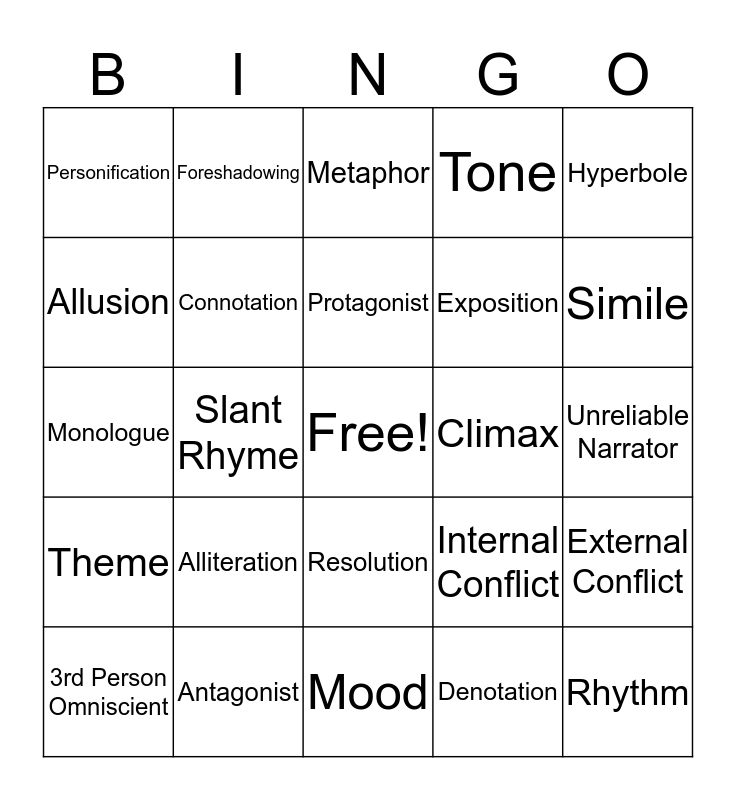 This bingo card has a free space and 24 words: Alliteration, Antagonist, Protagonist, 3rd Person Omniscient, Hyperbole, Personification, Allusion, Foreshadowing, Climax, Resolution, Exposition, Monologue, Internal Conflict, External Conflict, Connotation, Denotation, Unreliable Narrator, Metaphor, Simile, Slant Rhyme, Rhythm, Theme, Tone and Mood.