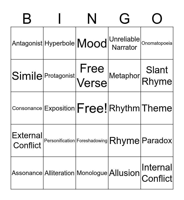 This bingo card has a free space and 24 words: Personification, Alliteration, Free Verse, Assonance, Onomatopoeia, Antagonist, Simile, Hyperbole, Rhythm, Foreshadowing, Metaphor, Consonance, Rhyme, Paradox, Protagonist, Allusion, Theme, Mood, Slant Rhyme, Exposition, Internal Conflict, External Conflict, Unreliable Narrator and Monologue.