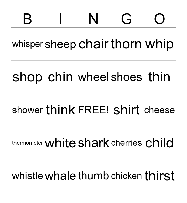 This bingo card has a free space and 24 words: white, whale, wheel, whistle, whip, whisper, shop, sheep, shirt, shark, shoes, shower, cherries, child, chin, chicken, cheese, chair, thin, think, thirst, thermometer, thorn and thumb.