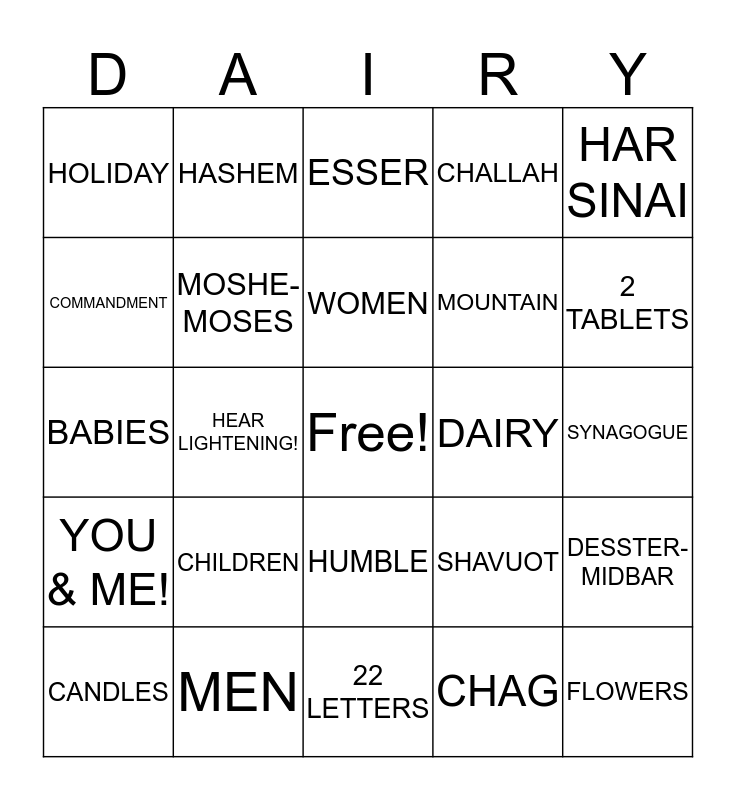 This bingo card has a free space and 31 words: 22 LETTERS, TORAH, HEAR LIGHTENING!, SEE THUNDER!, HOLIDAY, ESSER, MOSHE- MOSES, SHAVUOT, DAIRY, CHAG, SYNAGOGUE, FLOWERS, FLOWERS, GIFT, 2 TABLETS, ALEPH BET, DESSTER- MIDBAR, CHILDREN, YOU & ME!, HUMBLE, HAR SINAI, SIMCHA, CANDLES, HASHEM, MOUNTAIN, COMMANDMENT, CHALLAH, BABIES, MEN, WOMEN and CHILDREN.