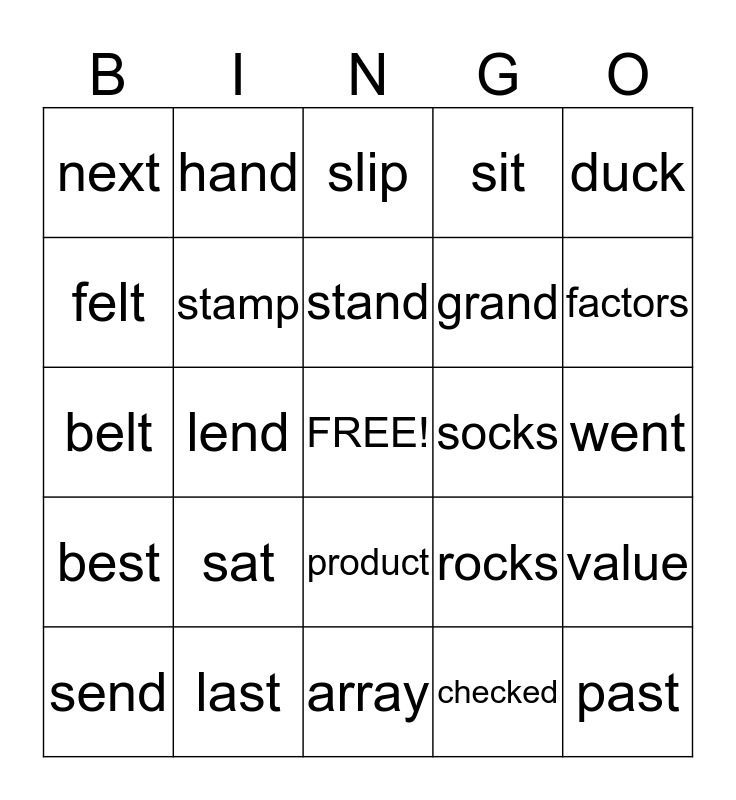 This bingo card has a free space and 24 words: sat, last, stand, send, duck, next, felt, hand, socks, product, grand, belt, rocks, value, stamp, checked, went, slip, factors, lend, past, best, sit and array.