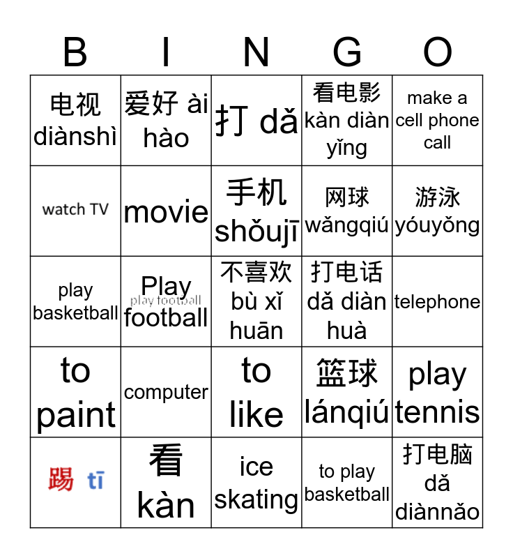 This bingo card has 3 images, a free space and 22 words: computer, 看kàn, 手机 shǒujī, make a cell phone call, 电视 diànshì, 爱好 ài hào, 打电话dǎ diàn huà, to like, 网球wǎngqiú, play basketball, 篮球 lánqiú, play tennis, movie, to play basketball, telephone, 打 dǎ, 游泳yóuyǒng, Play football, 打电脑dǎ diànnǎo, to paint, 看电影kàn diàn yǐng and ice skating.