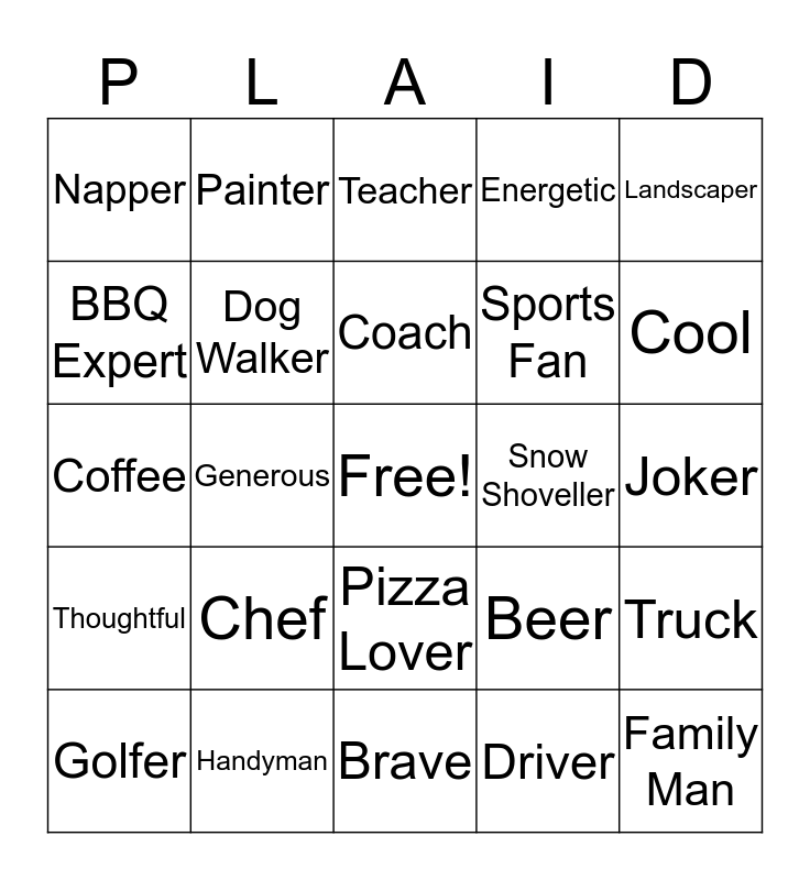 This bingo card has a free space and 24 words: Chef, Handyman, Coach, Golfer, Landscaper, Napper, BBQ Expert, Painter, Snow Shoveller, Pizza Lover, Sports Fan, Coffee, Beer, Truck, Dog Walker, Driver, Joker, Teacher, Cool, Generous, Family Man, Thoughtful, Energetic and Brave.