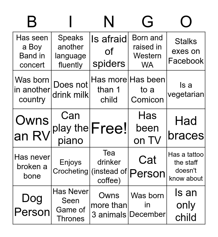 This bingo card has a free space and 24 words: Enjoys Crocheting, Has Never Seen Game of Thrones, Has more than 1 child, Dog Person, Stalks exes on Facebook, Has seen a Boy Band in concert, Was born in another country, Speaks another language fluently, Has been on TV, Tea drinker (instead of coffee), Has been to a Comicon, Owns an RV, Cat Person, Has a tattoo the staff doesn't know about, Does not drink milk, Was born in December, Had braces, Is afraid of spiders, Is a vegetarian, Can play the piano, Is an only child, Has never broken a bone, Born and raised in Western WA and Owns more than 3 animals.