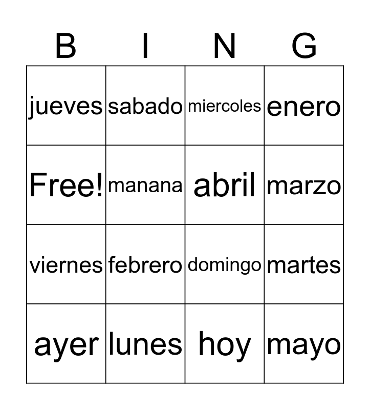 This bingo card has 16 words: lunes, martes, miercoles, jueves, viernes, sabado, domingo, hoy, Free!, manana, ayer, enero, febrero, marzo, abril and mayo.