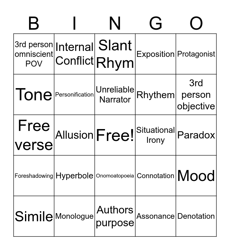 This bingo card has a free space and 29 words: Simile, Consonance, Allusion, Theme, 3rd person omniscient POV, Slant Rhym, Personification, Hyperbole, Situational Irony, Monologue, Paradox, Denotation, Authors purpose, Assonance, 3rd person objective, Alitteration, Onomoatopoeia, Foreshadowing, Protagonist, Free verse, Connotation, Figurative Language, Rhythem, Tone, Exposition, Internal Conflict, Mood, Unreliable Narrator and Stream of Consciousness.