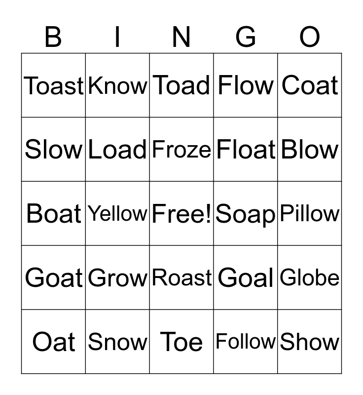 This bingo card has a free space and 29 words: Oat, Throw, Yellow, Shadow, Toast, Toad, Load, Grow, Soap, Snow, Pillow, Show, Toe, Follow, Blow, Road, Roast, Goat, Coat, Boat, Goal, Glow, Float, Slow, Flow, Know, Globe, Froze and Wrote.