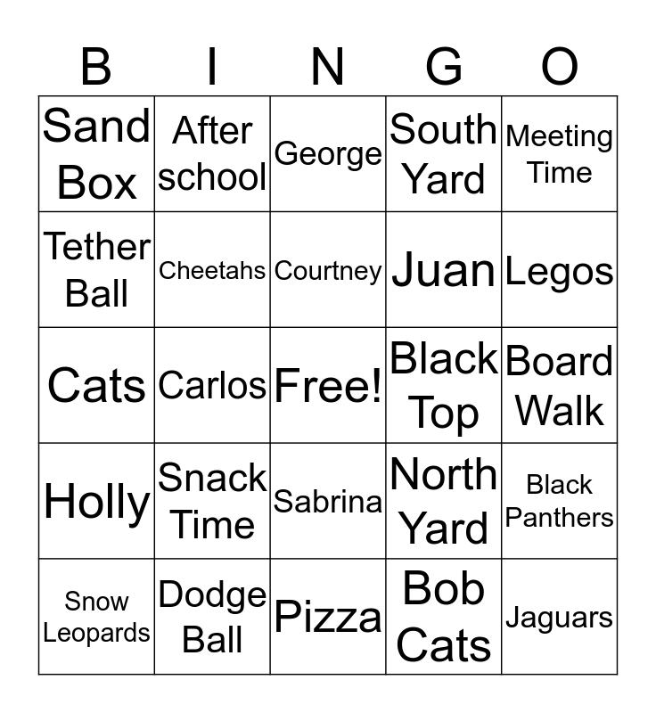 This bingo card has a free space and 24 words: Snack Time, Dodge Ball, Courtney, Snow Leopards, Meeting Time, Sand Box, Tether Ball, After school, Black Top, Sabrina, Juan, Cats, North Yard, Black Panthers, Cheetahs, Bob Cats, Board Walk, George, Legos, Carlos, Jaguars, Holly, South Yard and Pizza.