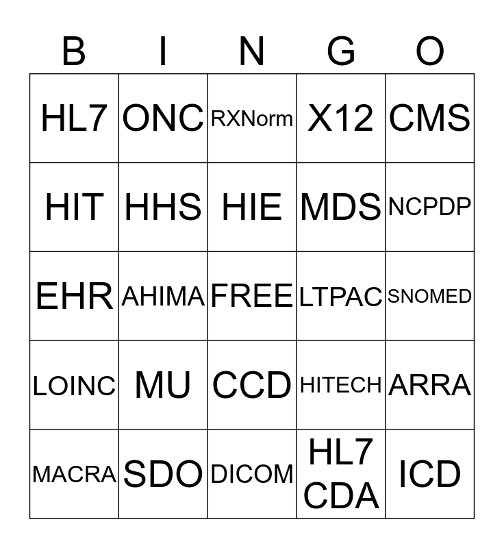 This bingo card has a free space and 24 words: MU, SDO, HIE, MACRA, CMS, HL7, HIT, ONC, LTPAC, CCD, MDS, EHR, HITECH, ARRA, HHS, HL7 CDA, SNOMED, RXNorm, NCPDP, AHIMA, ICD, LOINC, X12 and DICOM.