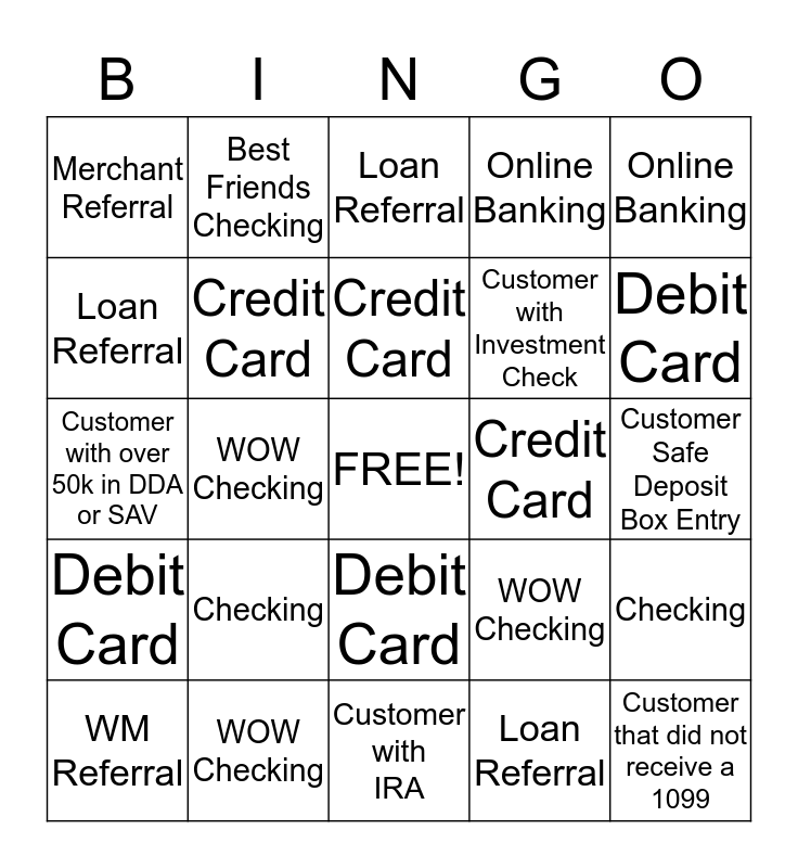 This bingo card has a free space and 24 words: Checking, WOW Checking, Credit Card, WM Referral, Online Banking, Merchant Referral, Loan Referral, Best Friends Checking, Credit Card, Debit Card, Customer with Investment Check, Customer with over 50k in DDA or SAV, WOW Checking, Checking, Credit Card, Loan Referral, Customer Safe Deposit Box Entry, Loan Referral, Debit Card, WOW Checking, Customer that did not receive a 1099, Debit Card, Online Banking and Customer with IRA.