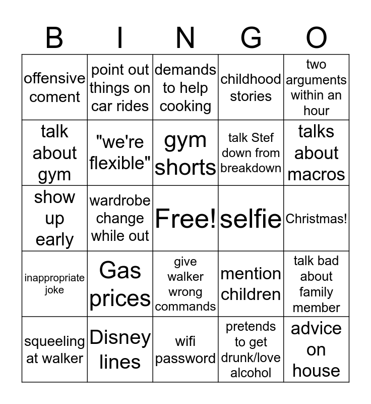 This bingo card has a free space and 24 words: Gas prices, Disney lines, gym shorts, squeeling at walker, two arguments within an hour, offensive coment, talk about gym, point out things on car rides, selfie, give walker wrong commands, talk Stef down from breakdown, show up early, mention children, talk bad about family member, "we're flexible", pretends to get drunk/love alcohol, Christmas!, demands to help cooking, talks about macros, wardrobe change while out, advice on house, inappropriate joke, childhood stories and wifi password.