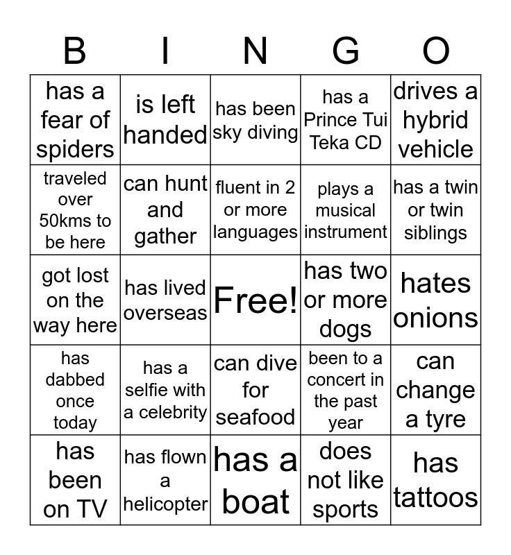 This bingo card has a free space and 24 words: has a selfie with a celebrity, has flown a helicopter, fluent in 2 or more languages, has been on TV, drives a hybrid vehicle, has a fear of spiders, traveled over 50kms to be here, is left handed, has two or more dogs, can dive for seafood, plays a musical instrument, got lost on the way here, been to a concert in the past year, can change a tyre, can hunt and gather, does not like sports, hates onions, has been sky diving, has a twin or twin siblings, has lived overseas, has tattoos, has dabbed once today, has a Prince Tui Teka CD and has a boat.