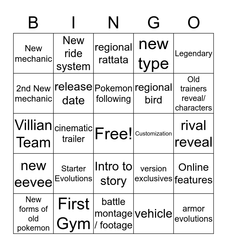 This bingo card has a free space and 24 words: Starter Evolutions, First Gym, Pokemon following, New forms of old pokemon, Legendary, New mechanic, 2nd New mechanic, New ride system, Customization, Intro to story, regional bird, Villian Team, version exclusives, Online features, release date, vehicle, rival reveal, regional rattata, Old trainers reveal/ characters, cinematic trailer, armor evolutions, new eevee, new type and battle montage / footage.