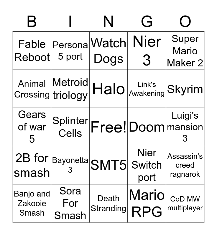 This bingo card has a free space and 24 words: Bayonetta 3, Sora For Smash, Halo, Banjo and Zakooie Smash, Super Mario Maker 2, Fable Reboot, Animal Crossing, Persona 5 port, Doom, SMT5, Link's Awakening, Gears of war 5, Nier Switch port, Assassin's creed ragnarok, Metroid triology, Mario RPG, Luigi's mansion 3, Watch Dogs, Skyrim, Splinter Cells, CoD MW multiplayer, 2B for smash, Nier 3 and Death Stranding.