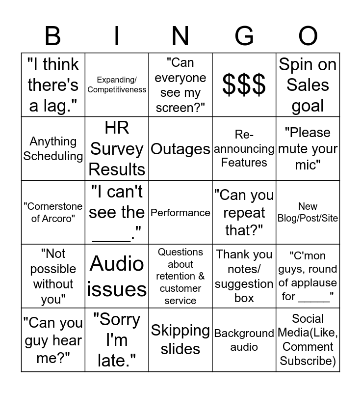 This bingo card has a free space and 29 words: "Can you guy hear me?", "Hi, who just joined?", "I can't see the ____.", A.I., "I think there's a lag.", "Can everyone see my screen?", HR Survey Results, Audio issues, "Can you repeat that?", "Sorry I'm late.", New Blog/Post/Site, Social Media(Like, Comment Subscribe), Skipping slides, Background audio, "Please mute your mic", Jim pulling his hair out, Questions about retention & customer service, "Not possible without you", Spin on Sales goal, "Cornerstone of Arcoro", Thank you notes/ suggestion box, Employee of the month, Re-announcing Features, Anything Scheduling, $$$, Expanding/ Competitiveness, "C'mon guys, round of applause for _____", Outages and Efficiency.