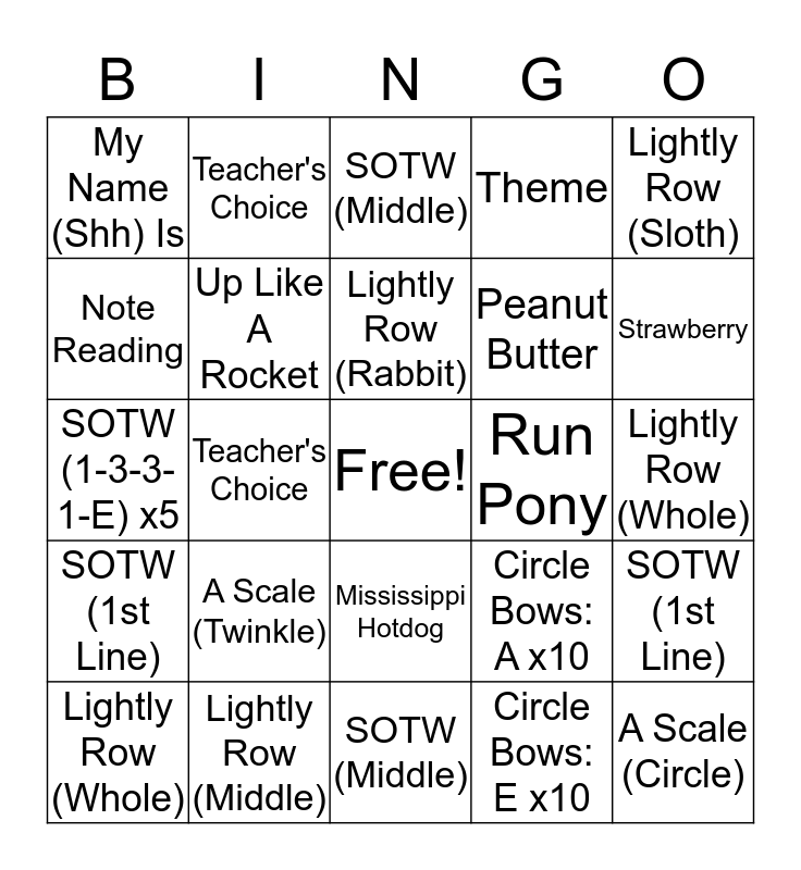 This bingo card has a free space and 24 words: A Scale (Twinkle), Lightly Row (Middle), Lightly Row (Rabbit), Lightly Row (Whole), Lightly Row (Sloth), My Name (Shh) Is, Note Reading, Teacher's Choice, Run Pony, Mississippi Hotdog, Peanut Butter, SOTW (1-3-3-1-E) x5, Circle Bows: A x10, SOTW (1st Line), Up Like A Rocket, Circle Bows: E x10, Lightly Row (Whole), SOTW (Middle), Strawberry, Teacher's Choice, A Scale (Circle), SOTW (1st Line), Theme and SOTW (Middle).