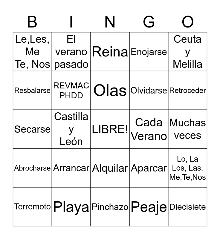 This bingo card has a free space and 31 words: Pinchazo, Quipu, Castilla y León, Arcén, Le,Les, Me Te, Nos, Reina, REVMAC PHDD, Aparcar, Cada Verano, Peaje, Muchas veces, Diecisiete, Ojalá, Vin,Di,Sal,Haz,Ten,Ve Pon, Sé, Retroceder, Remolcar, Lo, La Los, Las, Me,Te,Nos, Arrancar, Abrocharse, Alquilar, Ceuta y Melilla, Ferdinand y Isabel, Terremoto, El verano pasado, Olvidarse, Resbalarse, Enojarse, Secarse, Playa, Olas and Naufragio.