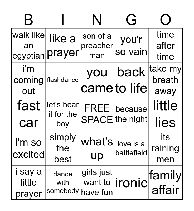 This bingo card has a free space and 45 words: total eclipse of the heart, family affair, poker face, i say a little prayer, black velvet, ironic, son of a preacher man, 9 to 5, time after time, dance with somebody, you'r so vain, because the night, what's up, simply the best, a natural woman, girls just want to have fun, sweet dreams, fast car, alone, take my breath away, like a prayer, holding out for a hero, pump up the jam, walk like an egyptian, tell it to my heart, little lies, push it, don't go, love is a battlefield, i'm so excited, edge of seventeen, its raining men, i think we are alone now, teardrops, manic Monday, let's hear it for the boy, Betty Davis eyes, Gloria, Luka, you came, i'm coming out, back to life, voyage voyage, flashdance and dancing queen.